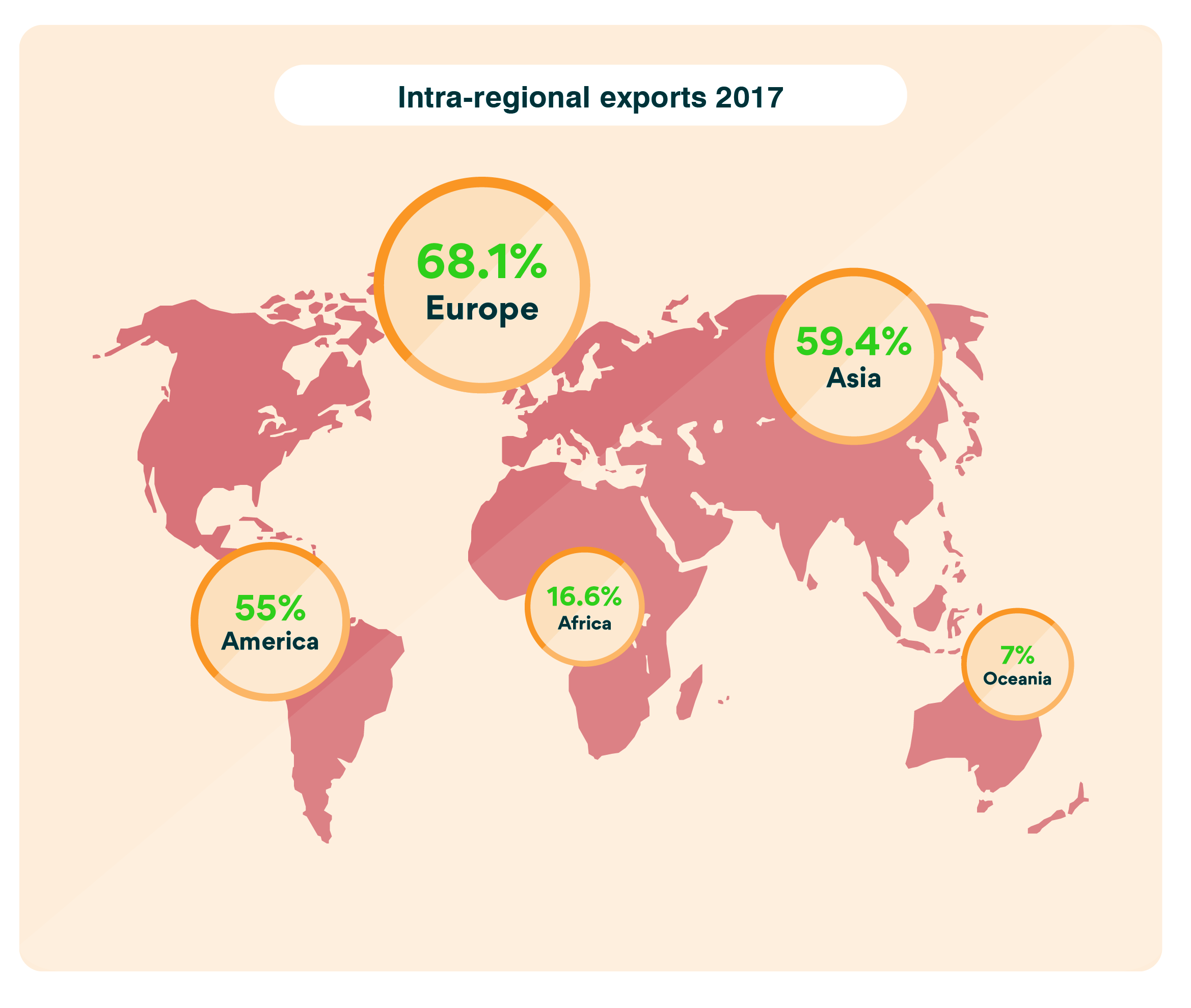 According to UNCTAD's Economic Development in Africa Report 2019 , intra-African exports made up 16.6% of all exports in 2017 compared to 68.1% in Europe, 59.4% in Asia, 55% in America, and 7% in Oceania.