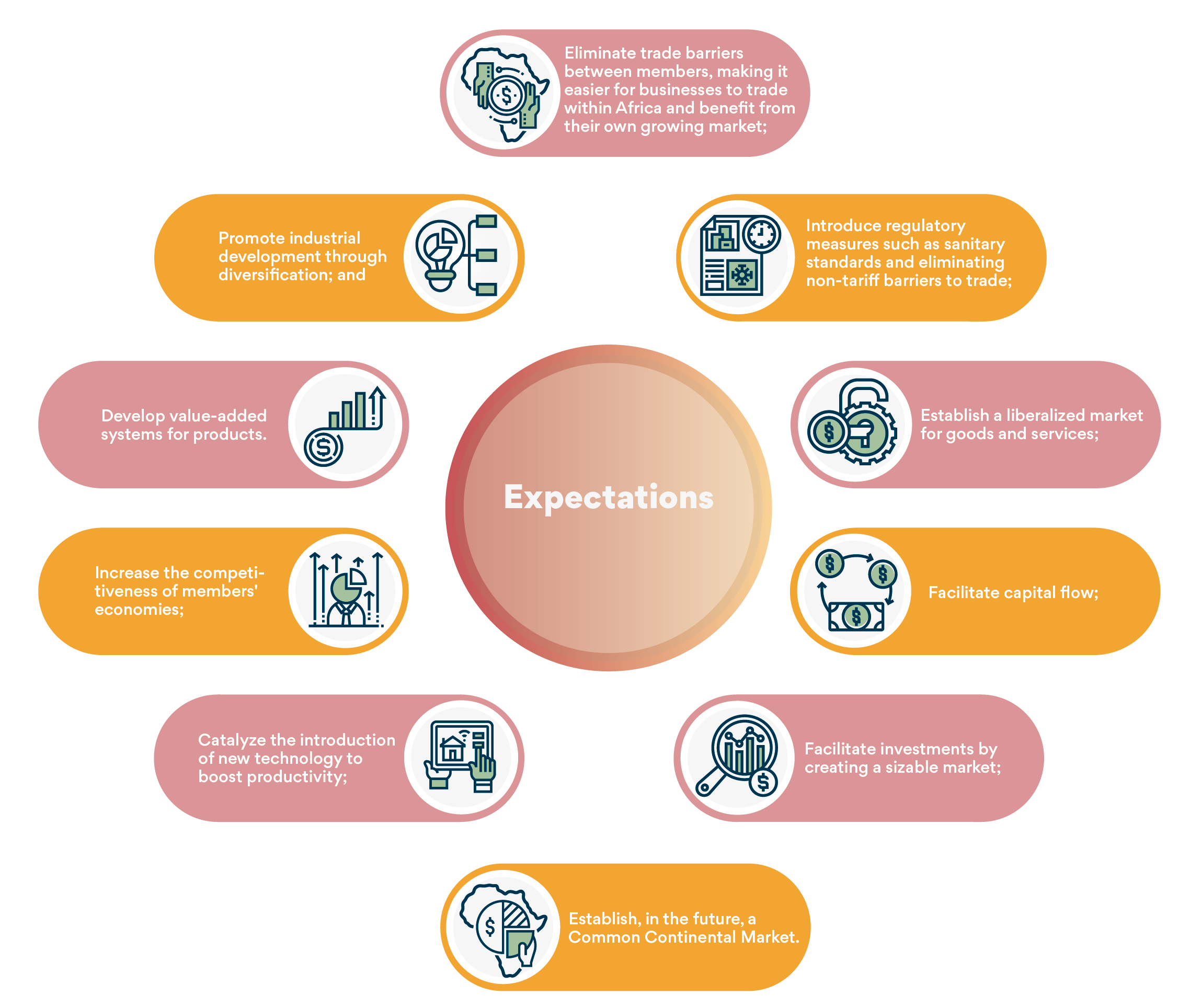 - Eliminate trade barriers between members, making it easier for businesses to trade within Africa and benefit from their own growing market;