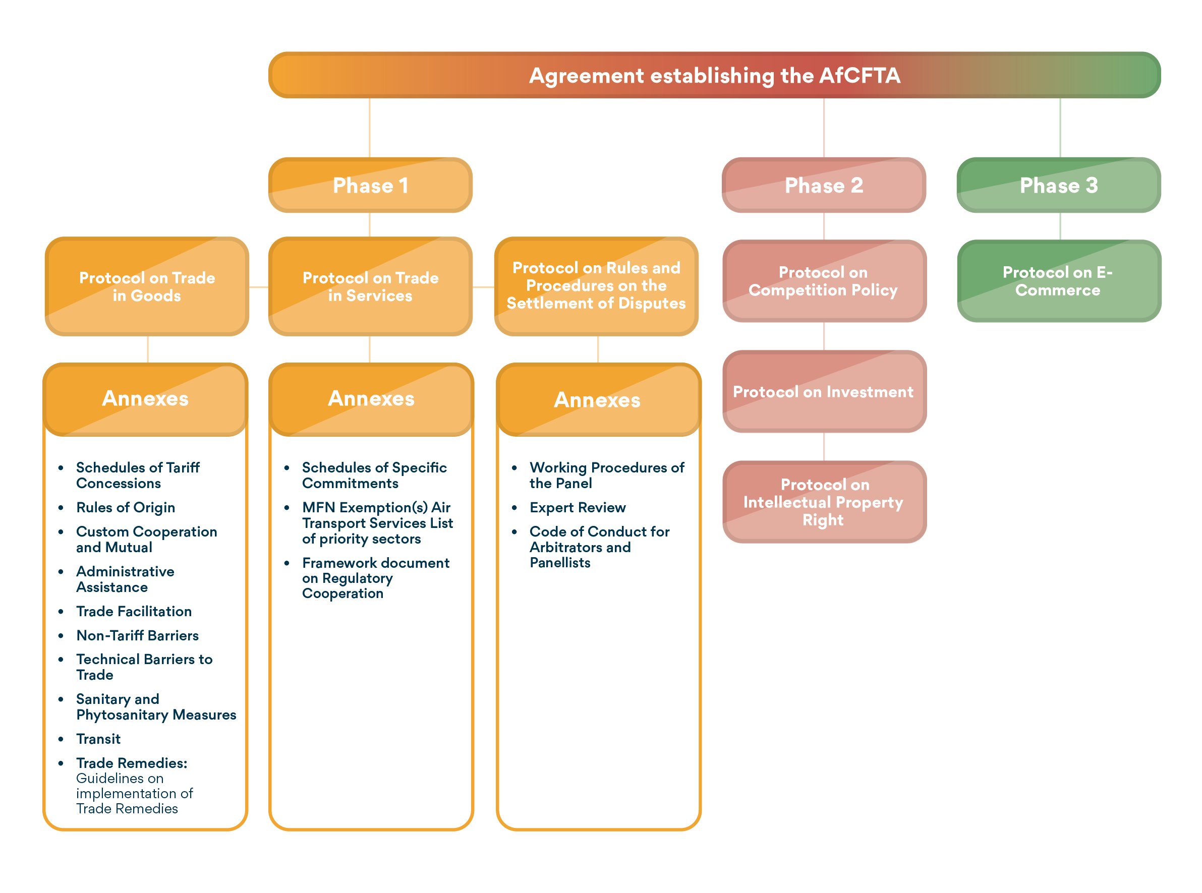 The AfCFTA negotiations take place in phases. Trade in goods and services as well as dispute resolution are both included in Phase I. Phase II deals with investment, competition policy, and intellectual property rights. E-commerce will be addressed in Phase III, which has been added.