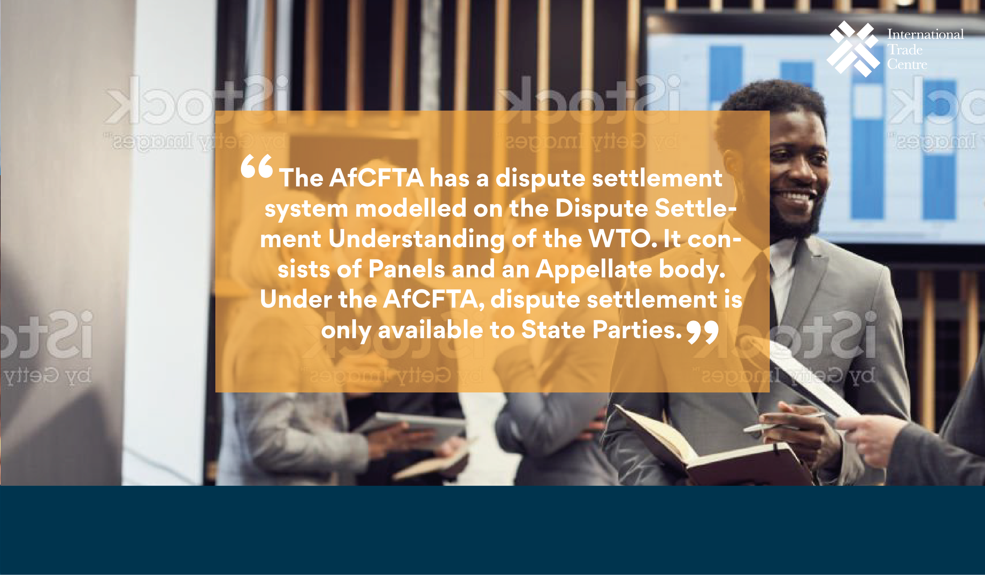 The AfCFTA has a dispute settlement system modelled on the Dispute Settlement Understanding of the WTO. It consists of Panels and an Appellate body. Under the AfCFTA, dispute settlement is only available to State Parties.