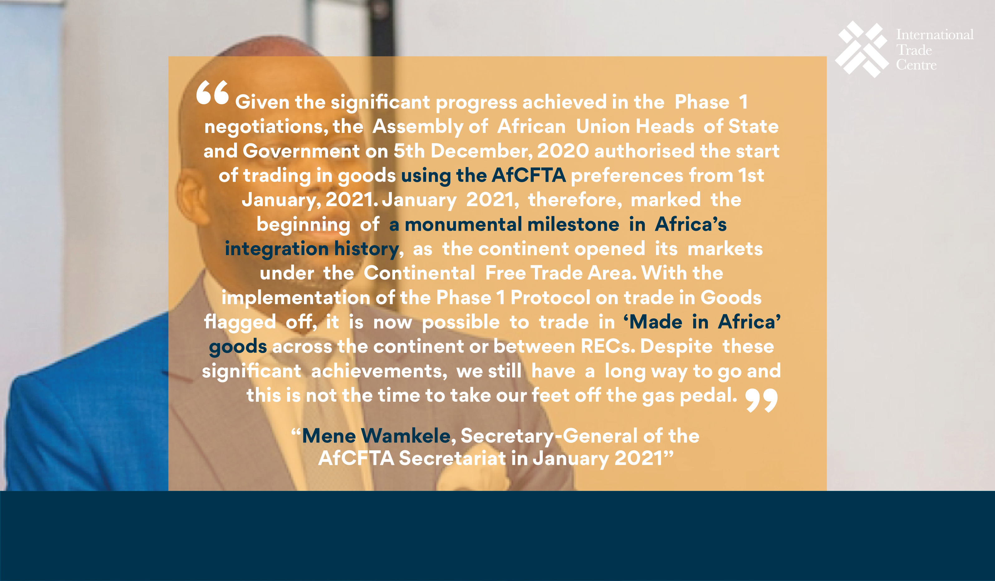 The Thirteenth Extraordinary Session of the African Union Assembly of Heads of State and Government held in Johannesburg in December 2020, decided that the start of trade under the African Continental Free Trade Area (AfCFTA) shall officially commence on 1 January 2021 on the basis of legally implementable and reciprocal schedules of tariffs concessions.