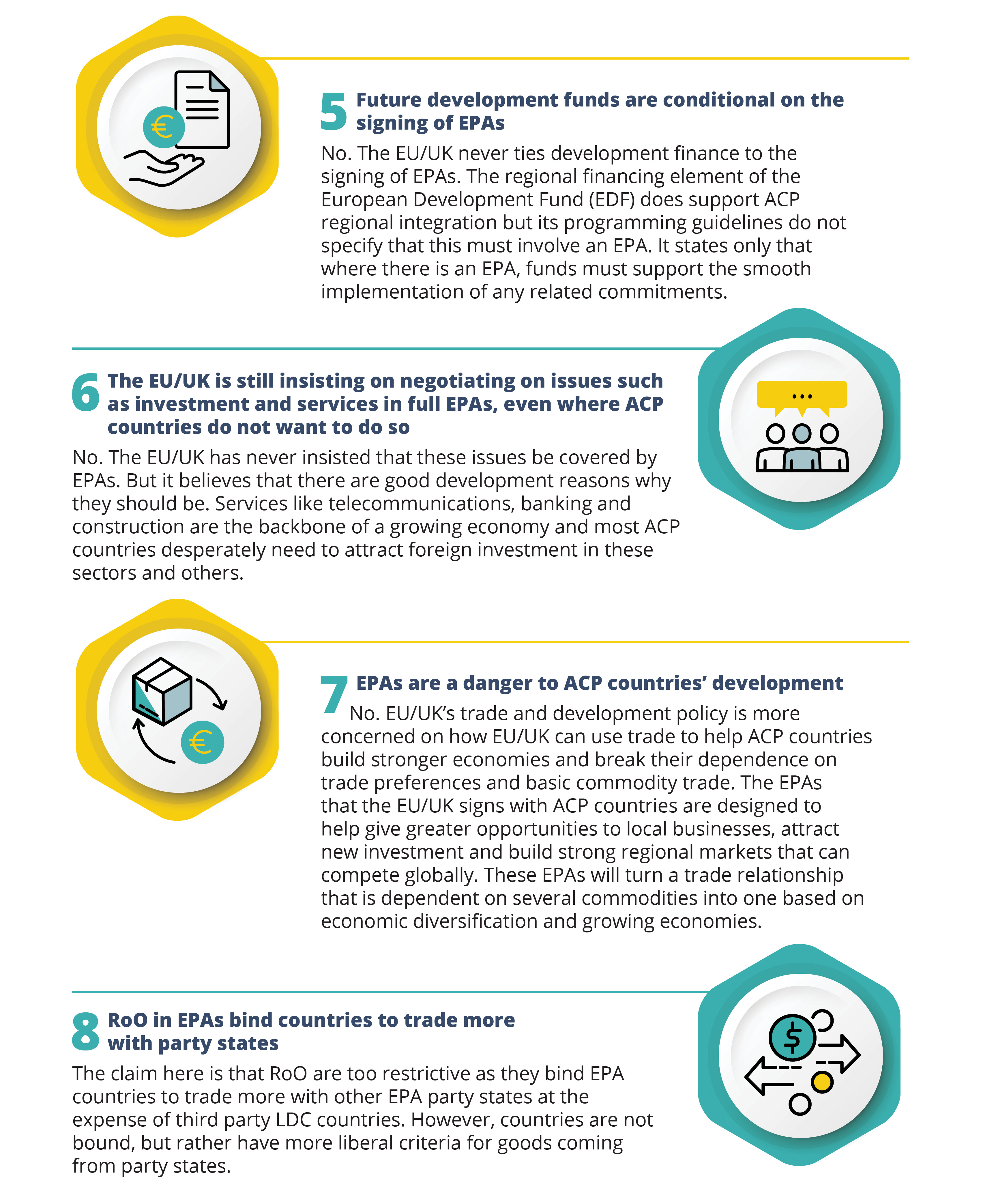 EPAs have sometimes been labelled as unfair by some commentators who argue that EPAs open ACP markets to international competition at the expense of local businesses. Other critics have accused EU-ACP EPAs of diluting the negotiating power of developing ACP countries, leaving them as rule takers. The followings are some most common misconceptions held by opponents of EU EPAs and their counterarguments[18], which will apply equally in the context of the new UK-ACP EPAs.