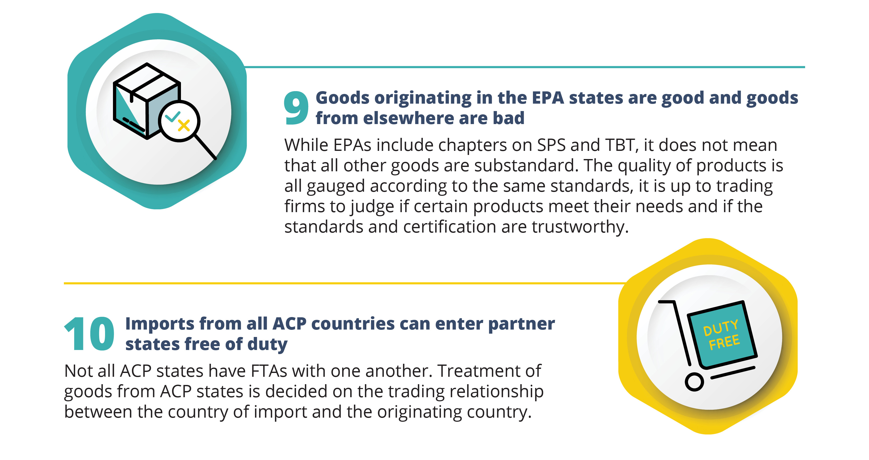 While EPAs include chapters on TBT and SPS, it does not mean that all other goods are substandard. The quality of products is all gauged according to the same standards, it is up to trading firms to judge if certain products meet their needs and if the standards and certification are trustworthy.