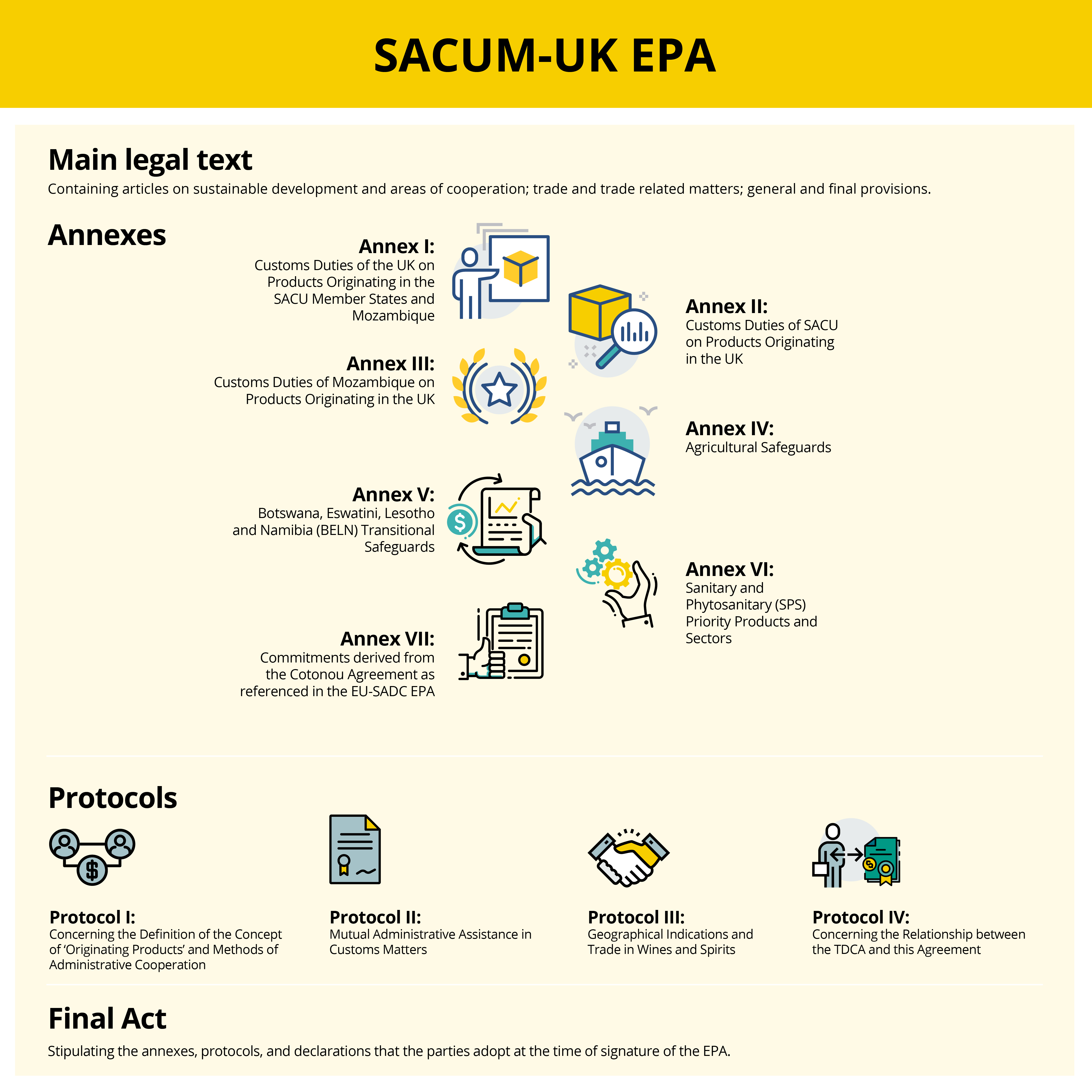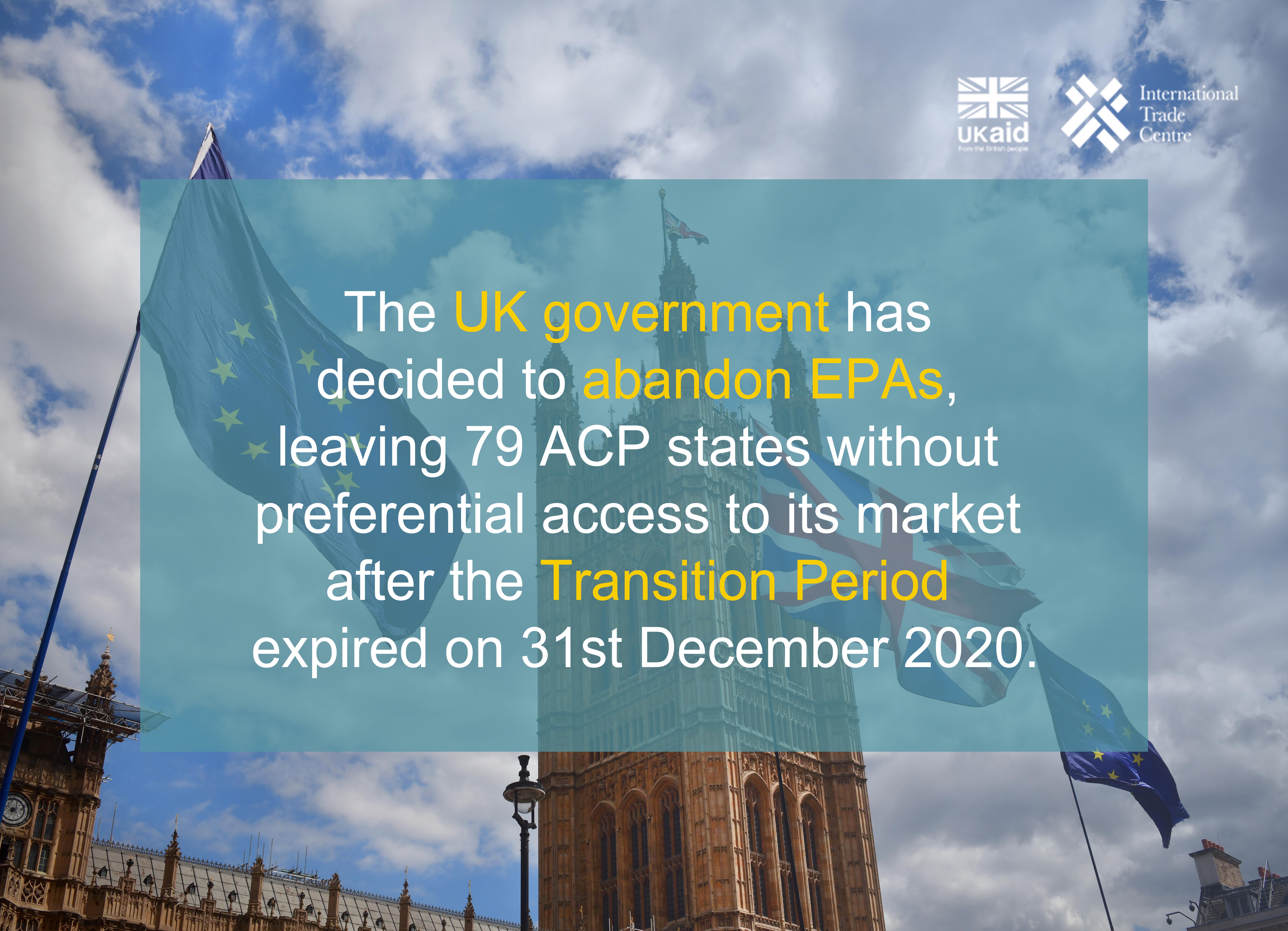 The Economic Partnership Agreements (EPAs) are comprehensive trade agreements between the United Kingdom (UK) and African, Caribbean and Pacific States (ACP). Their background dates from when the UK was a member of the European Union (EU). In an effort to update its prior trade relations with ACP countries, and ensure compliance with the rules of the World Trade Organisation (WTO), the EU has negotiated and signed Economic Partnership Agreements (EPAs) with African, Caribbean and Pacific Group of States (ACP). These include seven (7) EPAs with Central Africa, Eastern and Southern Africa (ESA), East African Community (EAC), Southern African Development Community (SADC), West Africa, Caribbean, and Pacific countries. The trade relations between the UK and ACP countries after it has left the EU are largely based on these EPAs.