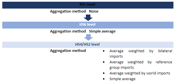 Two techniques are used to aggregate tariffs from HS6 to HS4 and/or HS2: simple average or trade-weighted average.