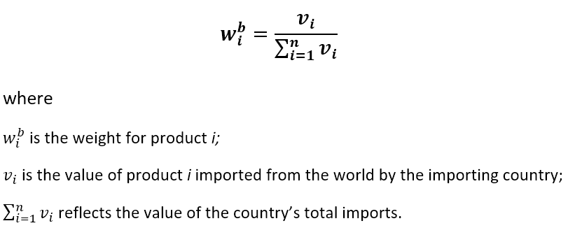 By default, Market Access Map prioritizes the trade-weighted approach, which is expressed as following: