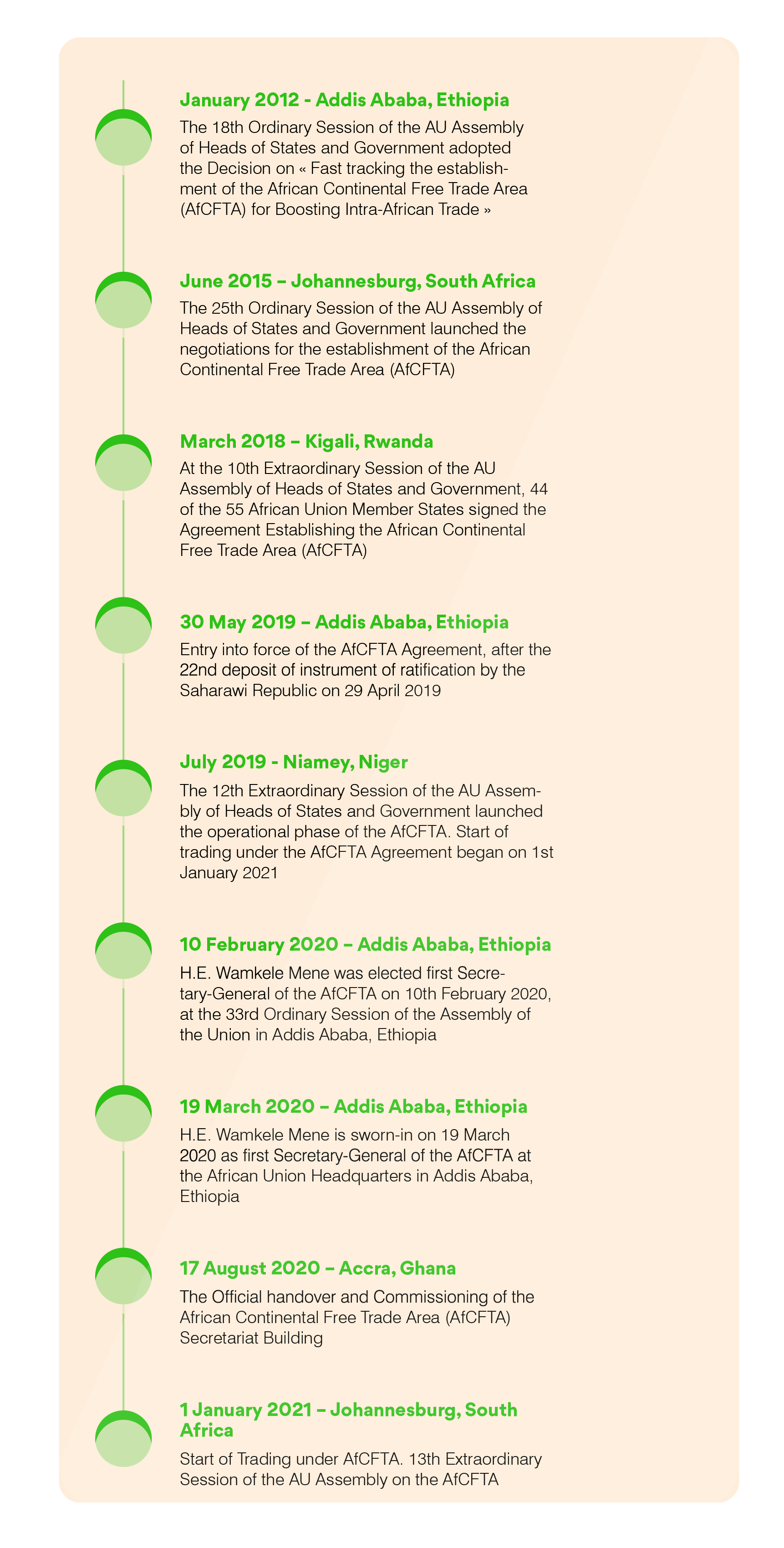 The Thirteenth Extraordinary Session of the African Union Assembly of Heads of State and Government held in Johannesburg in December 2020, decided that the start of trade under the African Continental Free Trade Area (AfCFTA) shall officially commence on 1 January 2021 on the basis of legally implementable and reciprocal schedules of tariffs concessions.