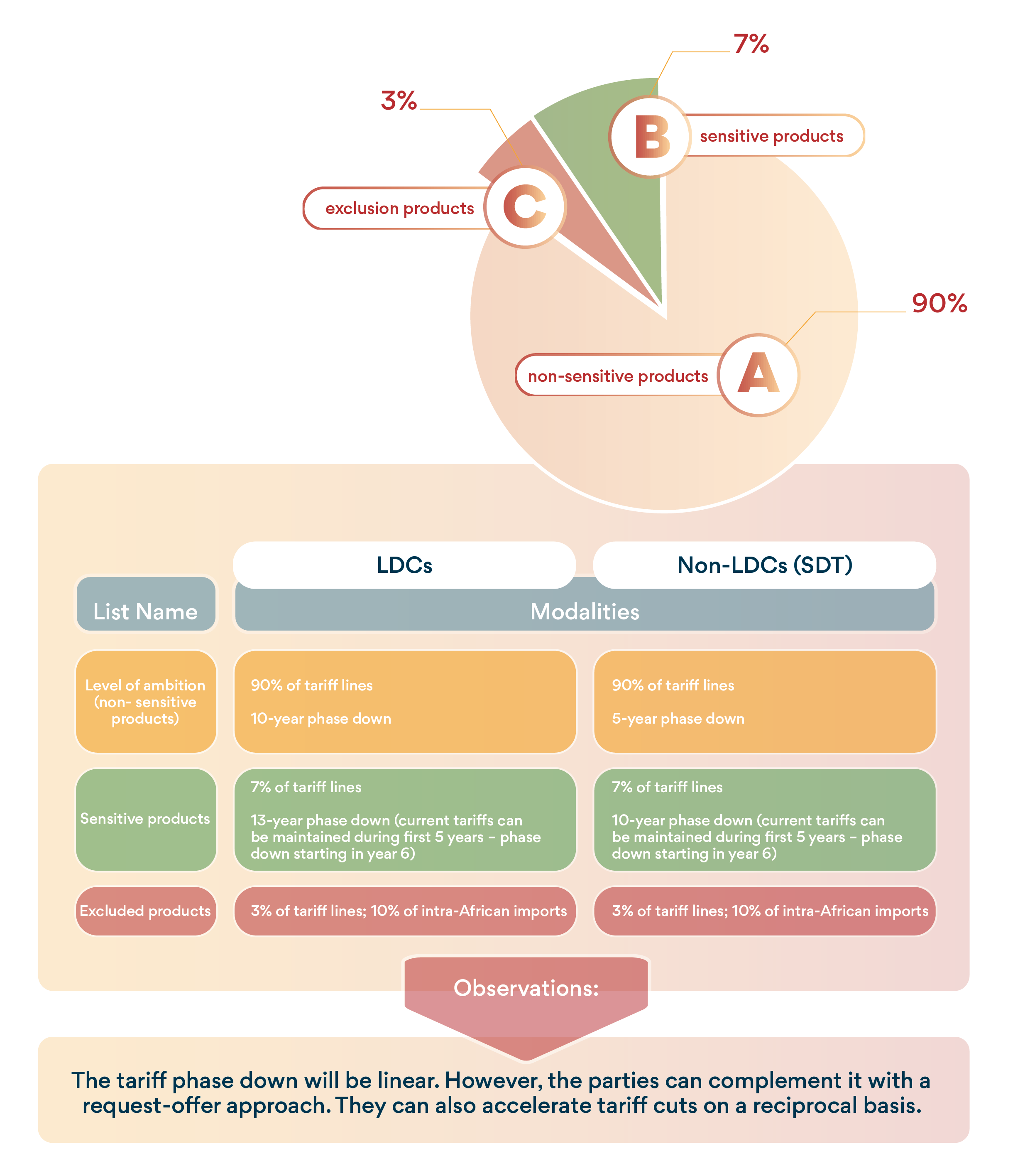 Tariff liberalization under the AfCFTA takes place in line with the AfCFTA Tariff Modalities. Each country or customs union (ECOWAS, CEMAC, SACU, EAC) designates a schedule of tariff concessions which includes: At least 90% of products are non-sensitive (category A) and the base rate, which is the most-favoured nation (MFN) tariff applied as of May 2019, is dismantled within 5 years (for LDCs 10 years); 7% of products are sensitive (category B) and the base rate is dismantled within 10 years with a flexibility of a transitional period of 5 years (for LDCs 13 years); no more than 3% of products are Exclusion List (category C) and no tariff reduction is applied. Excluded products in addition shall not exceed 10% of total import value from other State Parties. This clause is known as "double qualification and anti-concentration” clause. The recommended time range for assessment of import value is 2015-2017, or 2014-2016.