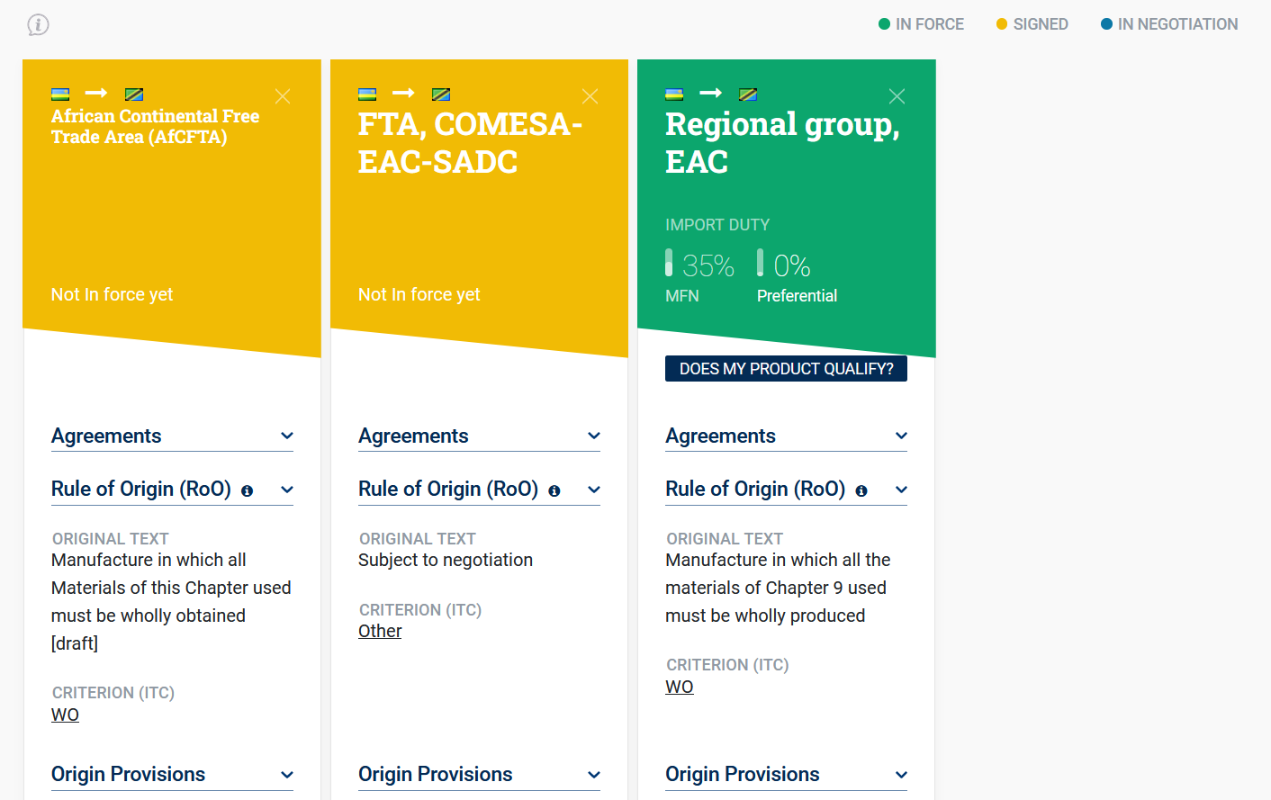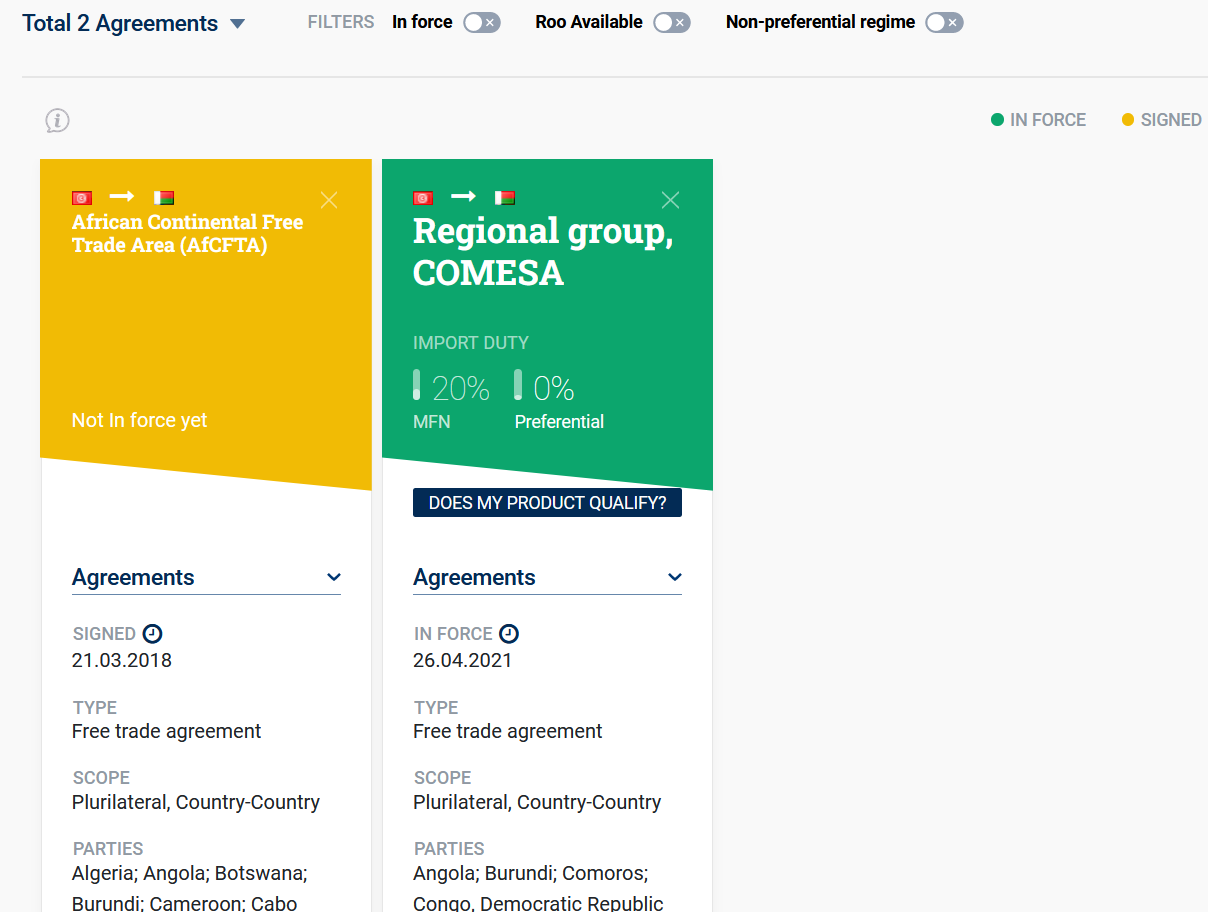 The only agreement that currently applies for juice is COMESA. AfCFTA is signed but not yet in force (operational) between the two countries. AfCFTA Guided Trade Initiative applies for Tunisia, but not Madagascar.