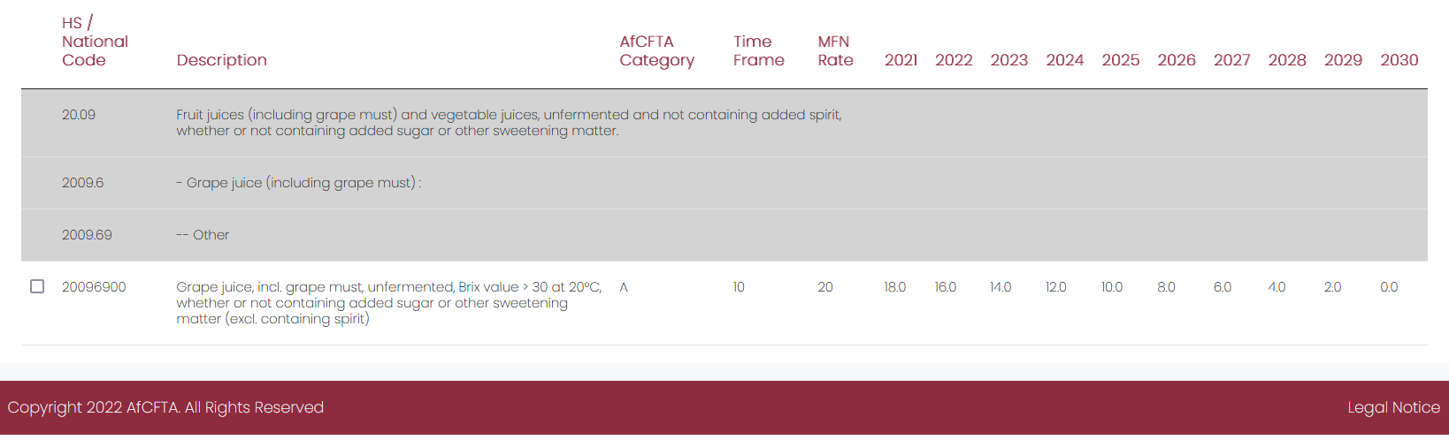 MFN rate is 20%, same as for grape juice. Using the e-Tariff Book (https://etariff.au-afcfta.org/) to find the tariff offers we insert as the importing country Madagascar. Madagascar maintains its 20% MFN rate under Category C (‘Exclusion list') and will not provide a AfCFTA preferential rate. AfCFTA should not be used because there are no duty savings.