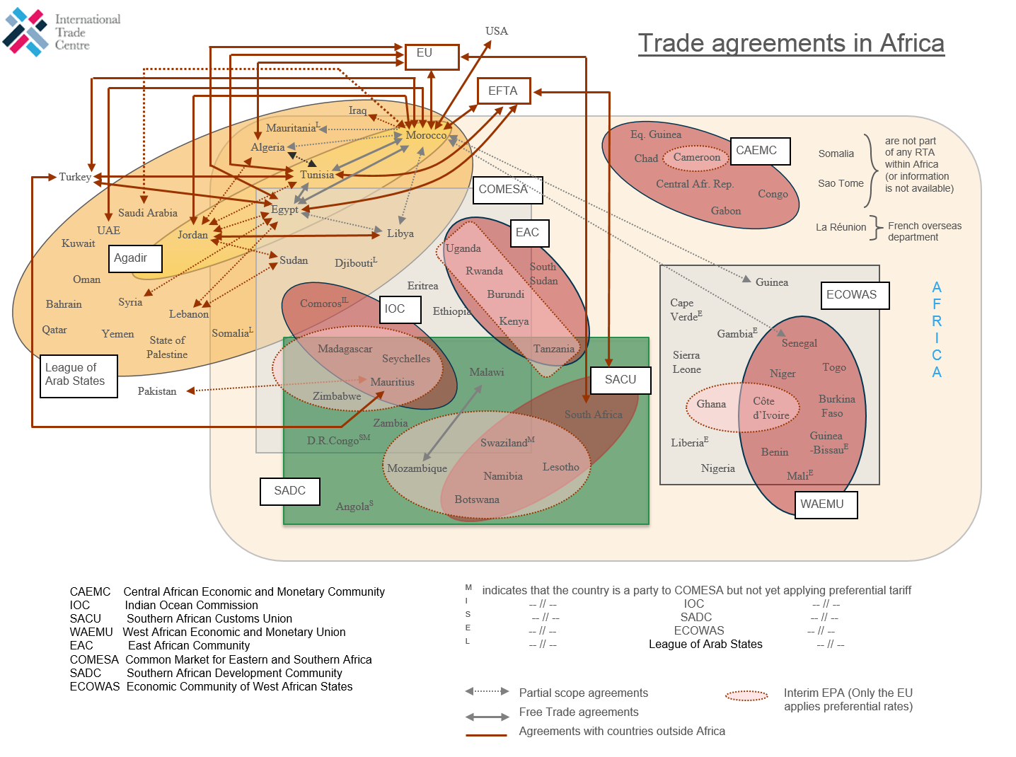 African trade integration has long been constrained by deteriorating border and transportation systems, as well as a patchwork of unique legislation in dozens of markets. Governments frequently create trade barriers to protect their home markets from regional competition, making trading with close neighbors more expensive than trading with nations considerably further away.