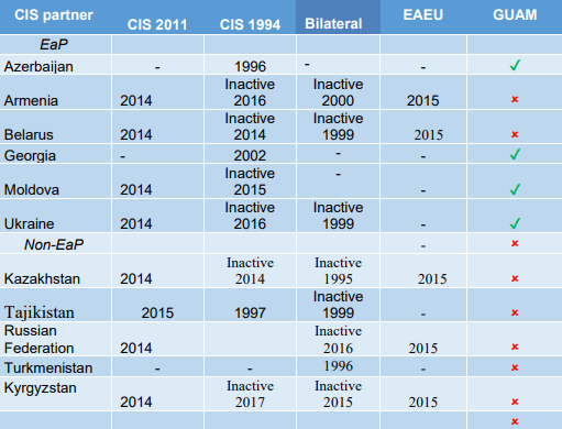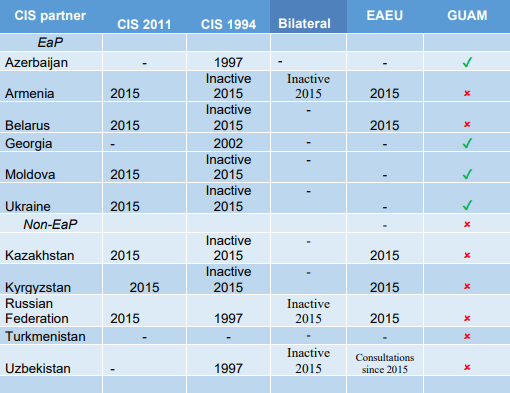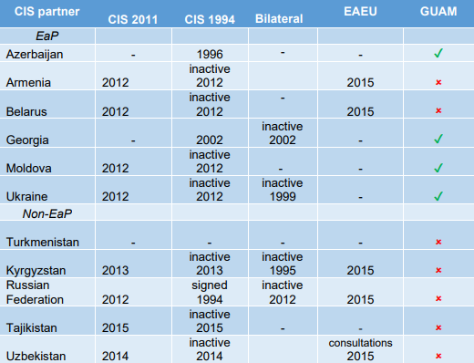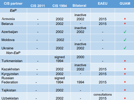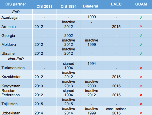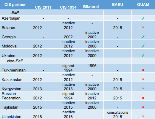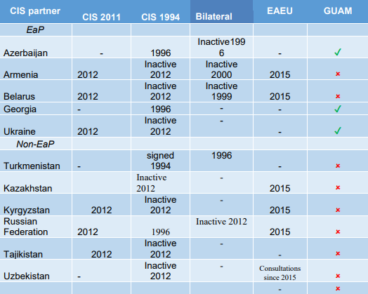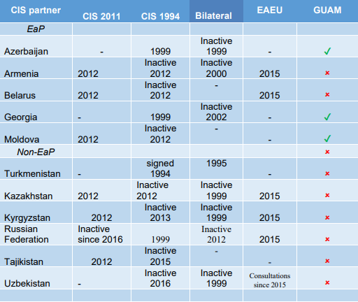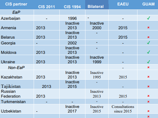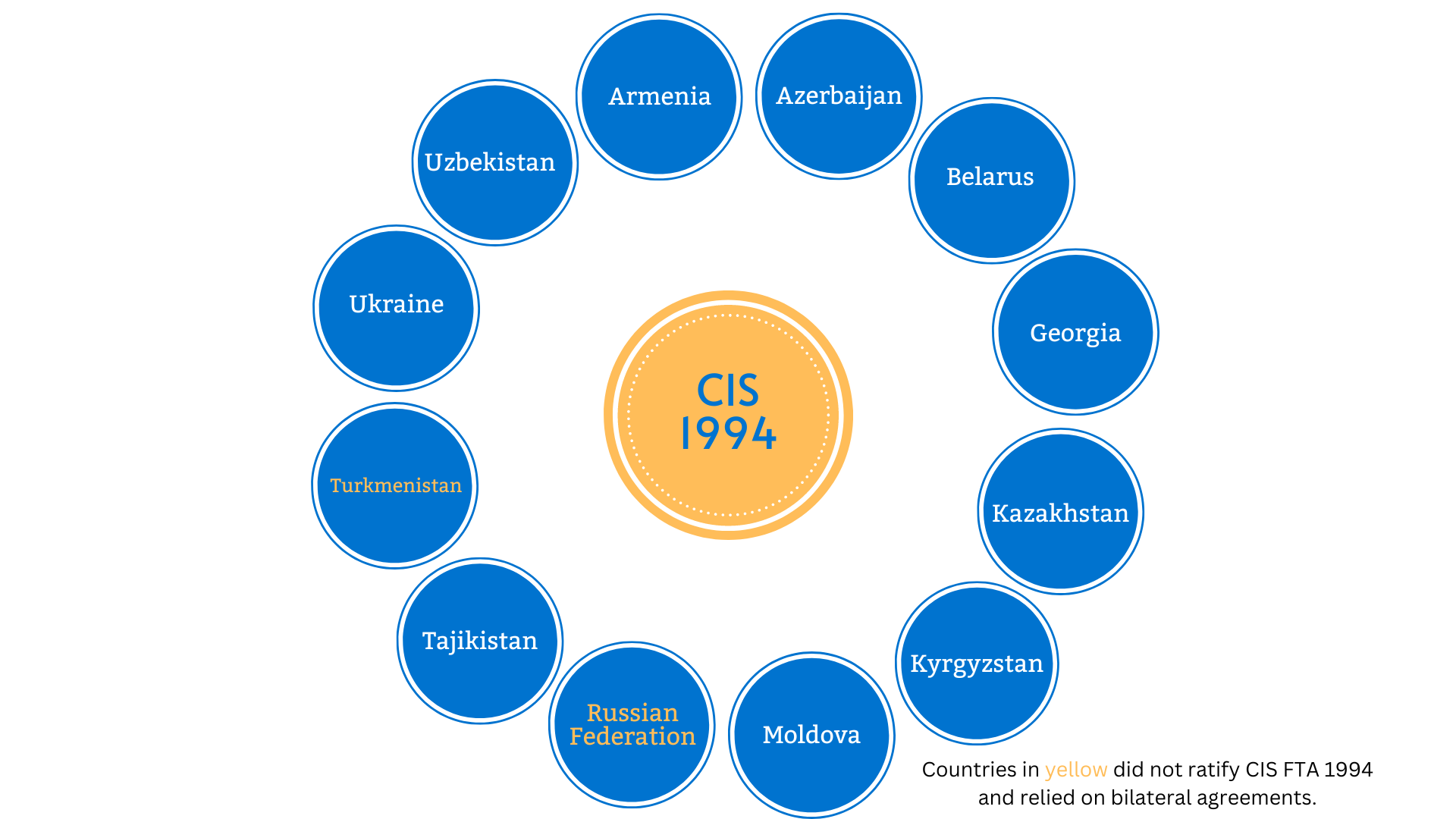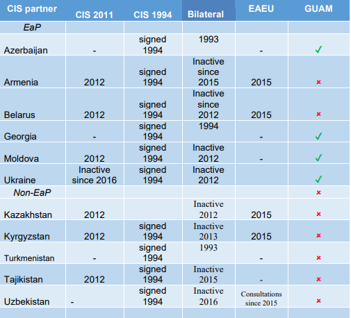 In 1994, Azerbaijan, Armenia, Belarus, Georgia, Kazakhstan, Kyrgyzstan, Moldova, Russia, Tajikistan, Turkmenistan, Ukraine and Uzbekistan signed an agreement on a Free trade area (FTA) (the “CIS 1994”). In 2011, Armenia, Belarus, Kazakhstan, Kyrgyzstan, Moldova, Russia, Tajikistan and Ukraine signed another regional agreement (the “CIS 2011”) which superseded and cancelled CIS 1994 between the acceding member states. CIS 2011 was NOT signed by Azerbaijan, Georgia and Turkmenistan. Uzbekistan signed the agreement in 2013 and currently applies it with other signatories. In 2016, Russia and Ukraine bilaterally terminated CIS 2011 and currently do not have a bilateral preferential regime. Turkmenistan did not ratify CIS 1994 and did not sign CIS 2011, however Turkmenistan is covered by bilateral FTAs with most CIS countries, including all EaP countries [2] .