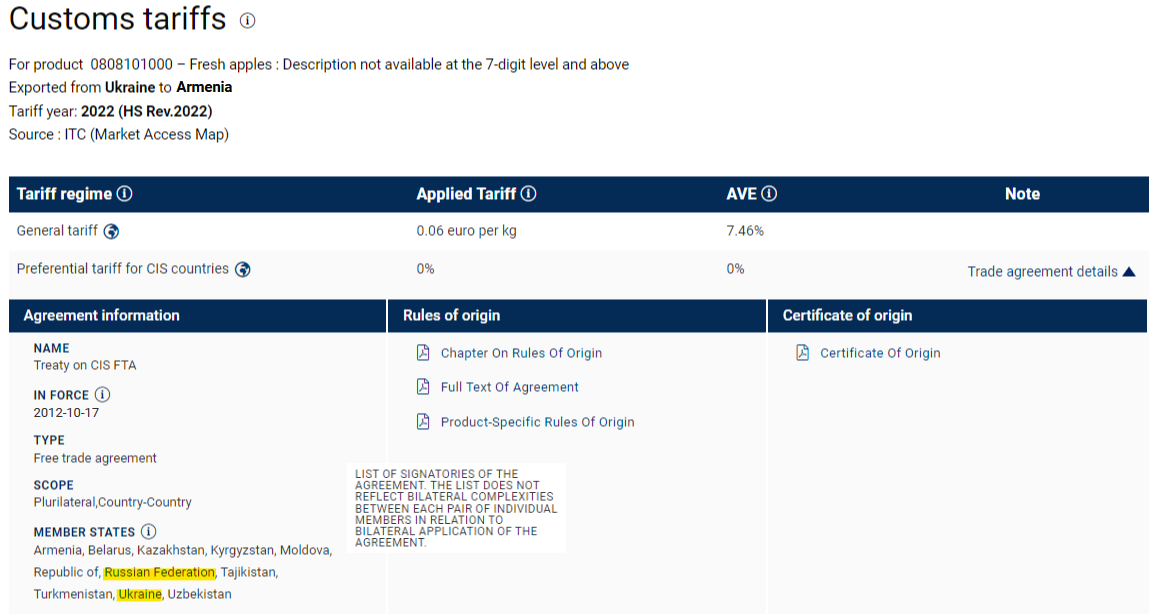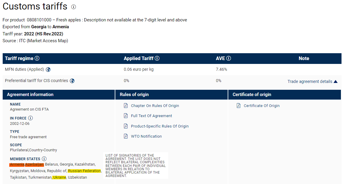 GUAM applies since 2003, and it refers to CIS FTA 1994 ROO on interim basis. But since all 4 countries are CIS FTA 1994 members already (except the bilateral pair of Ukraine and Moldova who apply CIS 2011), this FTA is considered redundant for the final display to users in Market Access Map. However, in this explanatory web page it is mentioned among the existing FTAs in the region.