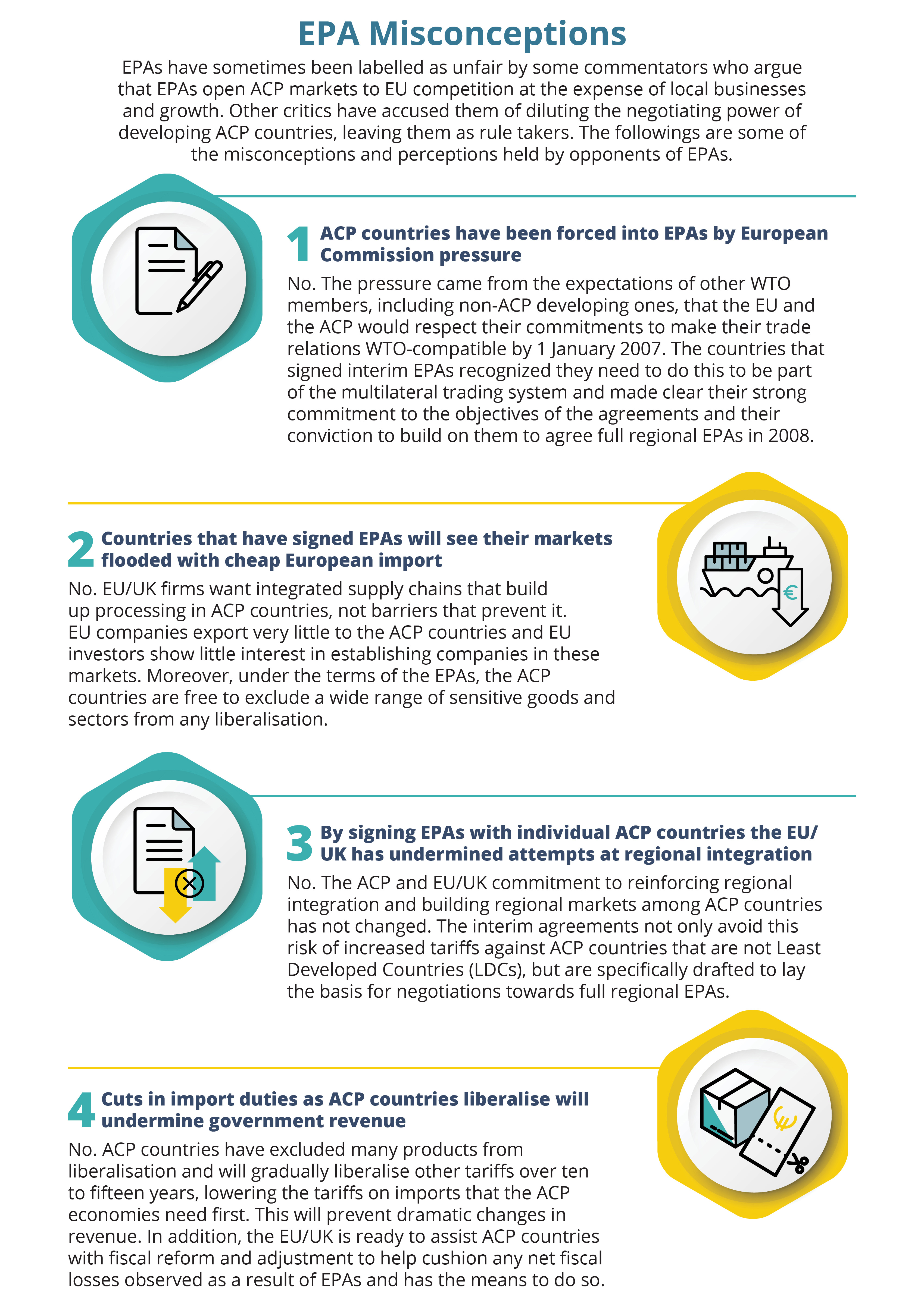 EPAs have sometimes been labelled as unfair by some commentators who argue that EPAs open ACP markets to international competition at the expense of local businesses. Other critics have accused EU-ACP EPAs of diluting the negotiating power of developing ACP countries, leaving them as rule takers. The followings are some most common misconceptions held by opponents of EU EPAs and their counterarguments[18], which will apply equally in the context of the new UK-ACP EPAs.