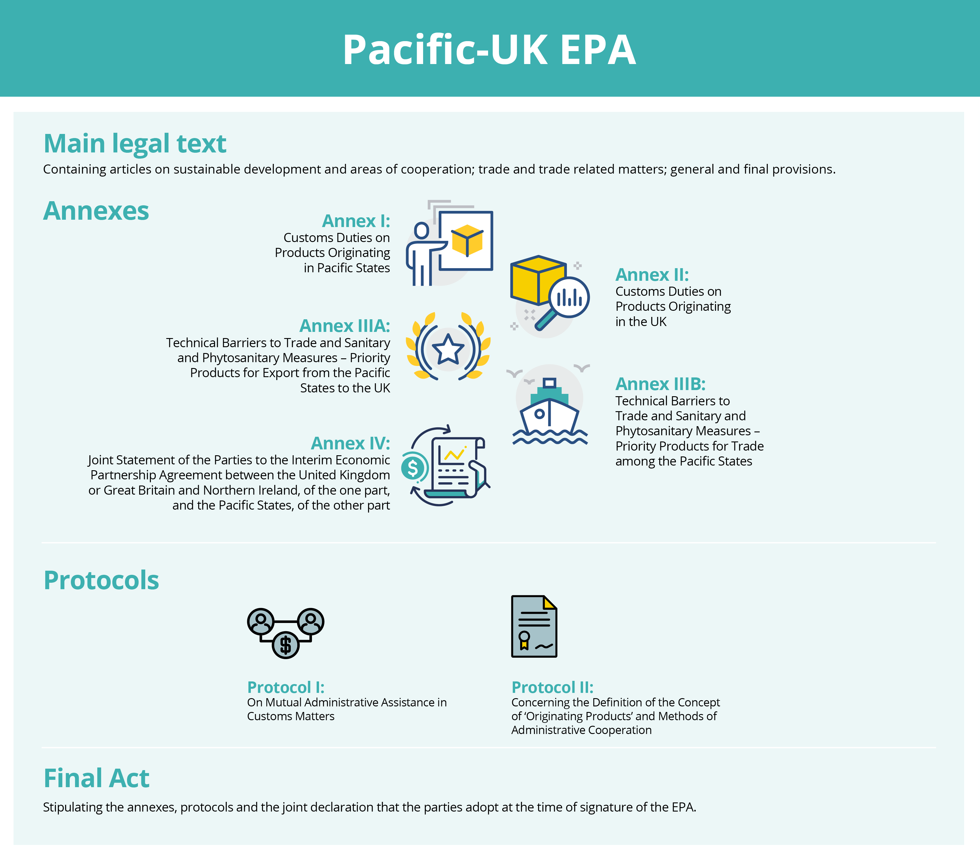 The Economic Partnership Agreements (EPAs) are comprehensive trade agreements between the United Kingdom (UK) and African, Caribbean and Pacific States (ACP). Their background dates from when the UK was a member of the European Union (EU). In an effort to update its prior trade relations with ACP countries, and ensure compliance with the rules of the World Trade Organisation (WTO), the EU has negotiated and signed Economic Partnership Agreements (EPAs) with African, Caribbean and Pacific Group of States (ACP). These include seven (7) EPAs with Central Africa, Eastern and Southern Africa (ESA), East African Community (EAC), Southern African Development Community (SADC), West Africa, Caribbean, and Pacific countries. The trade relations between the UK and ACP countries after it has left the EU are largely based on these EPAs.
