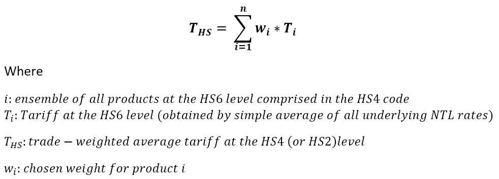 Two techniques are used to aggregate tariffs from HS6 to HS4 and/or HS2: simple average or trade-weighted average.